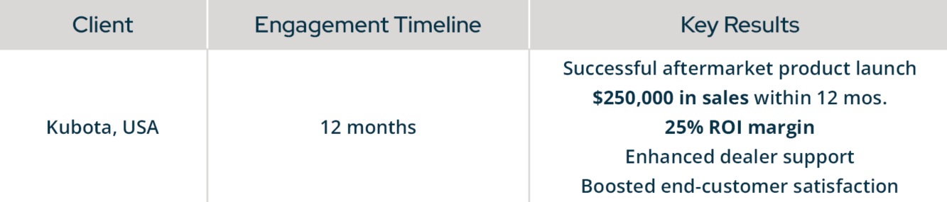 The Integration Group (TIG) proactively identified an aftermarket product gap and developed a product that would fill an end-customer need for Kubota. TIG also orchestrated a comprehensive launch — including pick, pack and ship fulfillment — that resulted in $250,000 in sales with a 25% ROI margin within just 12 months.