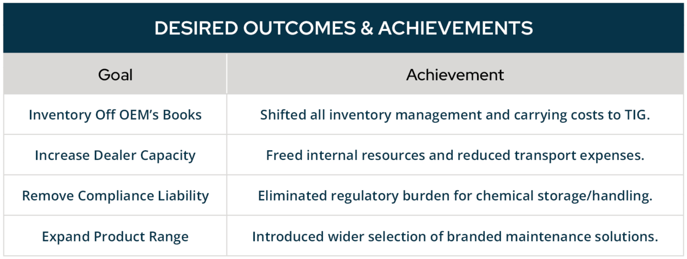 This OEM faced significant challenges in managing the sourcing, compliance, and fulfillment of chemical, workshop, and maintenance products for its dealer network. The existing process tied up capital, strained resources, and carried regulatory risk. They needed a trusted partner who could:
