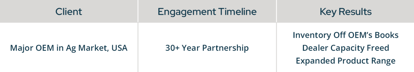 A global leader in agricultural, construction, and forestry equipment, partnered with The Integration Group (TIG) to transform the way its 2,200+ U.S. dealers source, stock, and manage maintenance products. Through an exclusive supply chain program, TIG delivers branded chemical, workshop, and maintenance products while managing inventory, fulfillment, compliance, and dealer support. This partnership allows this OEM to focus on its core business while enhancing dealer efficiency and customer satisfaction.
